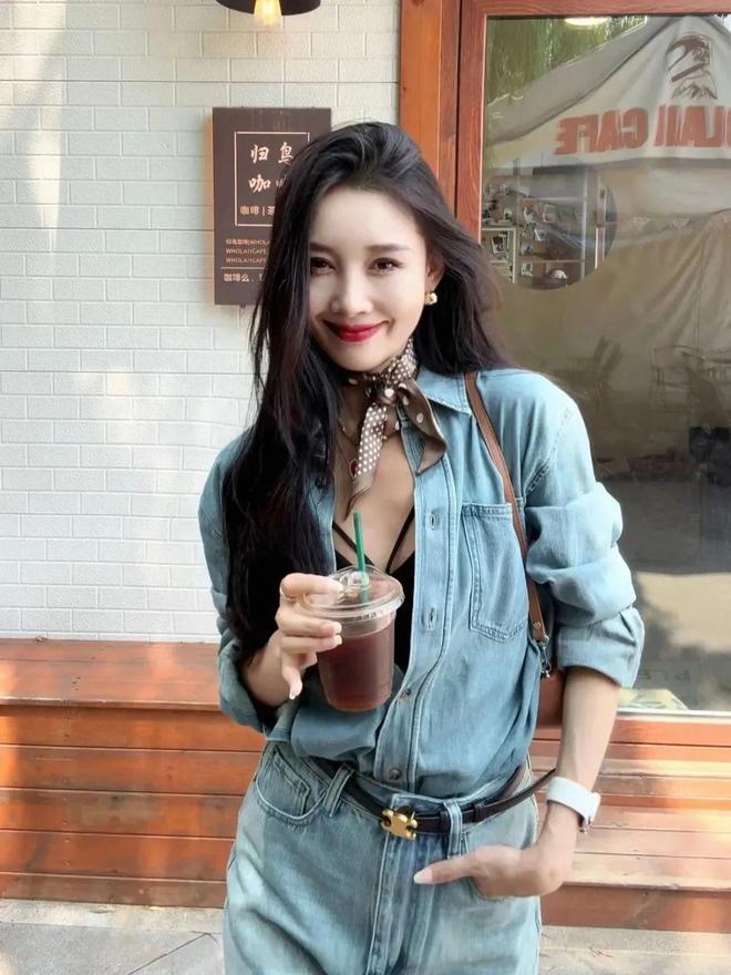 一手插兜,姿态放松,传递随性气质;一手举着饮品,向镜头展示,拉近与观者距离。面带微笑看向镜头,眼神明亮,整体姿势既凸显穿搭风格,又营造出热情友好、惬意享受生活的氛围。
